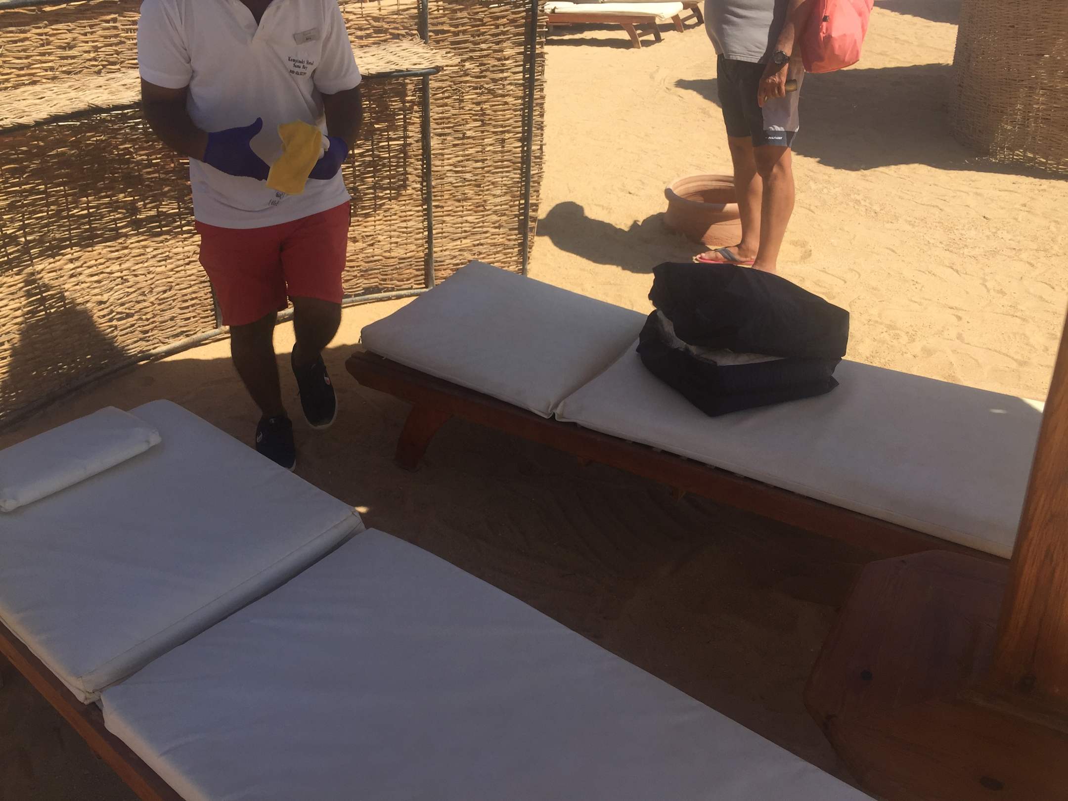 Auch am Strand steht die Hygiene an erster Stelle. Die Handtücher werden in geschlossenen Plastiktragetaschen geliefert und die Liegen jedesmal desinfiziert, bevor ein neuer Gast kommt.