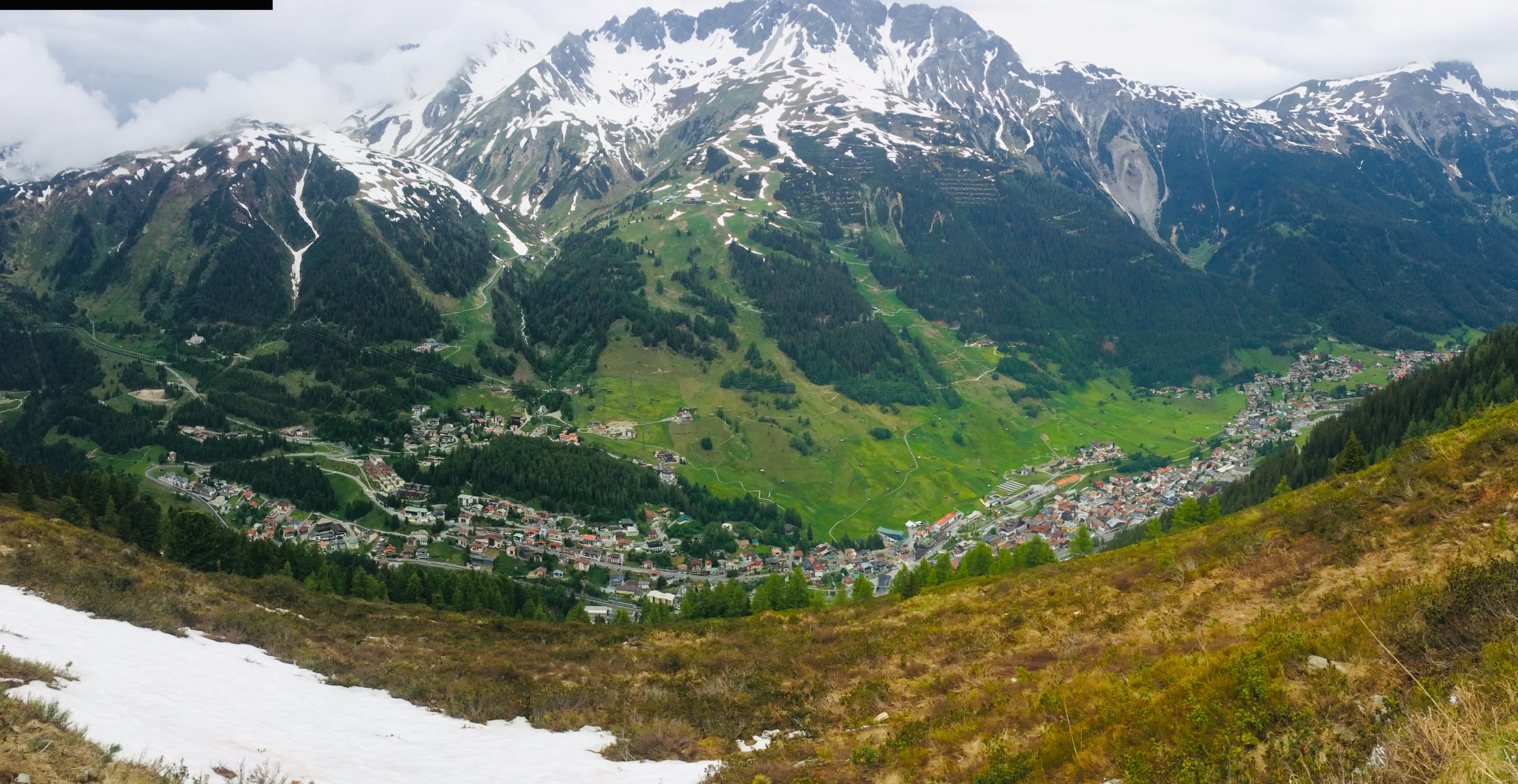 Blick vom Rendl auf den Ort hinunter. Das Hotel liegt in der Mitte des linken Ortsteils