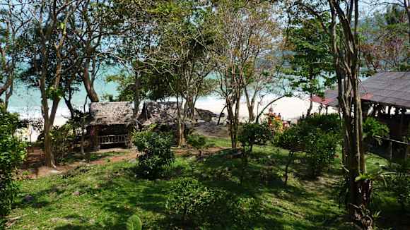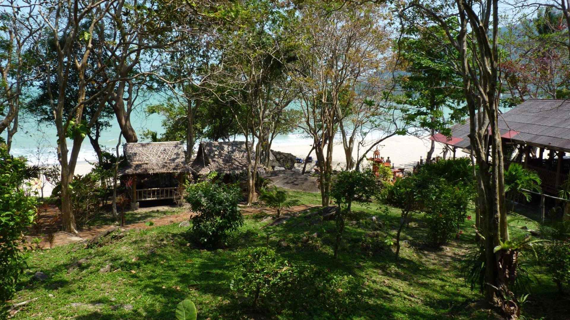 Blick zum Restaurant und Massagehüttendies ist der Blick Richtung Meer: in der Mitte die Massagehütten, rechts das Restaurant