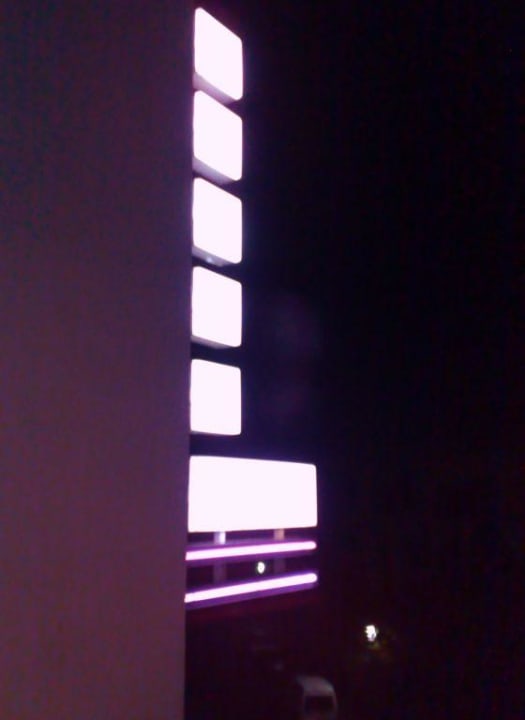 Leuchtschrift des Hotelsdieser schöne Rosa-Farbton leuchtet des Nachts schön ins Zimmer, Jalousien gibt es nicht!
