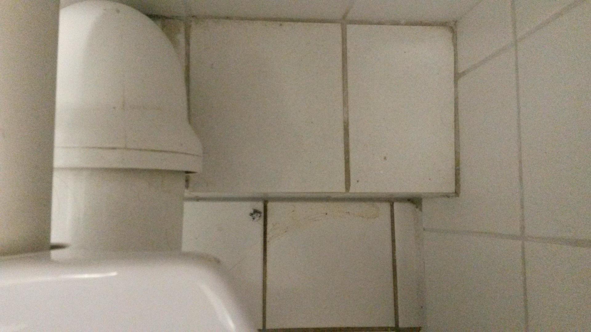 ToiletteHinter der Toilette: Eine größere Urinlache des Vorgängers im ungeputzten Bad...