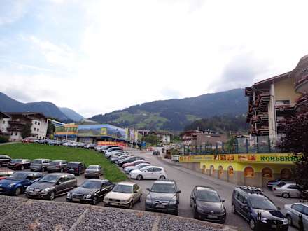 Ausblick vom Nebenhaus auf Parkplatz und Spieljoch