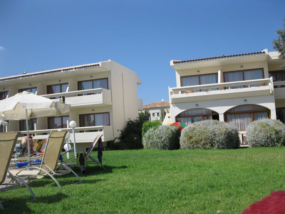 Blick vom Pool zu den Zimmern