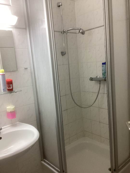 Badezimmer mit Duschkabine und Waschbecken.