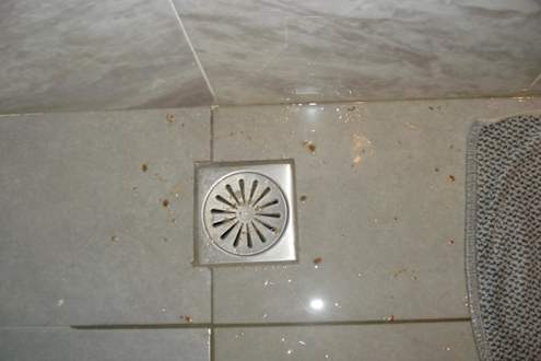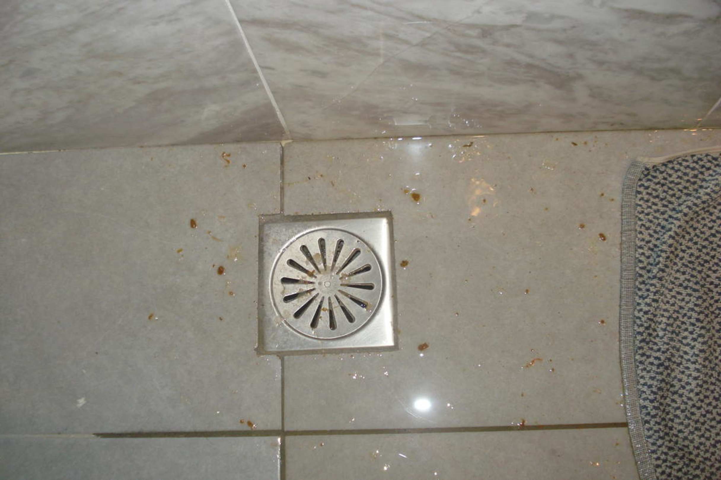 Fäkalien im BadAbfluss im Bad auf der Erde. Es gluckerte und dann kam die ganze SCH.... hoch und verteilte sich.