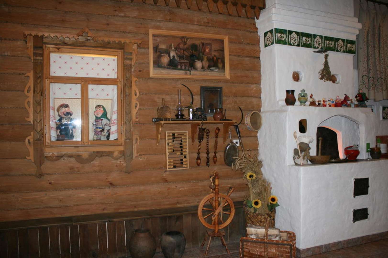 Babuschka und Djeduschka im Fenster neben dem Holzofen.