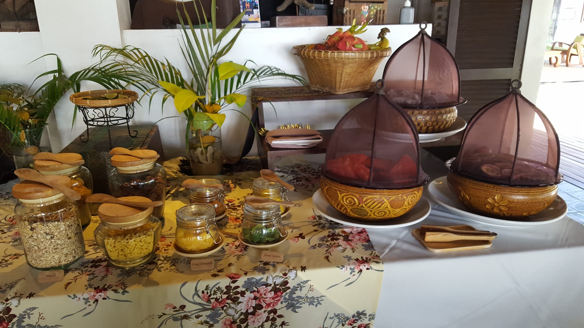 Teil des Frühstückbuffets mit Früchten und Cerealien