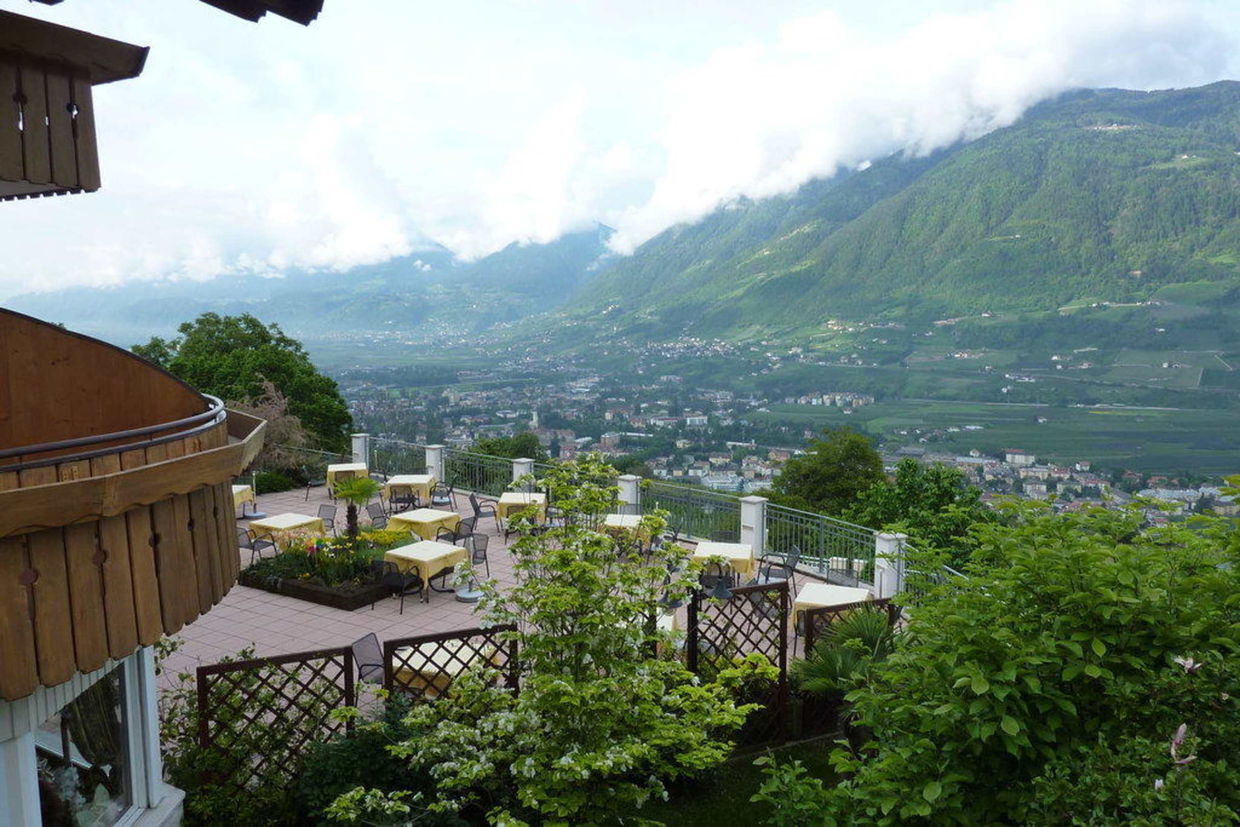 Blick von Balkon über Terrasse nach Meran