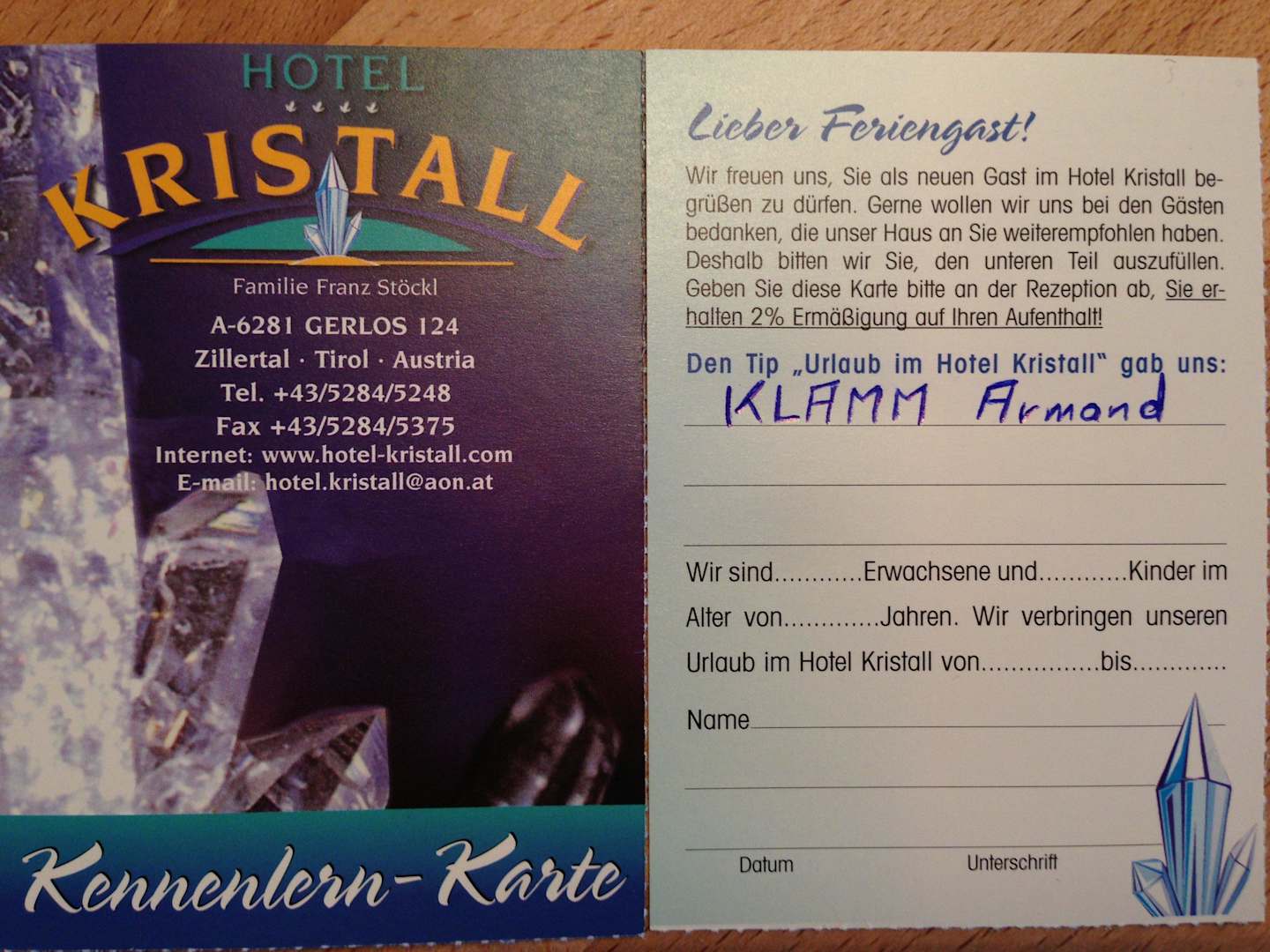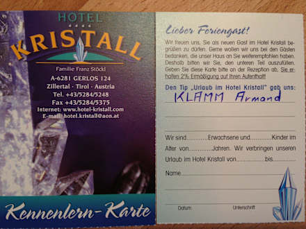Wenn Sie diesen Bon herausprinten, fertig ausfüllen und mit ins Hotel nehmen bekommen Sie einen Rabatt von 2%.