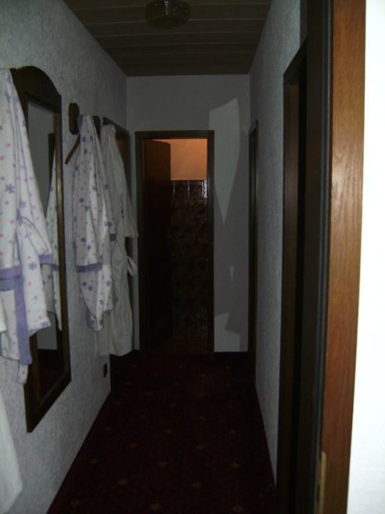 geradeaus ist die Toilette, gleich daneben rechts die Tür führt ins Bad und die Tür vorne rechts ins Kinderzimmer. Hinten links ist die Zimmertür.