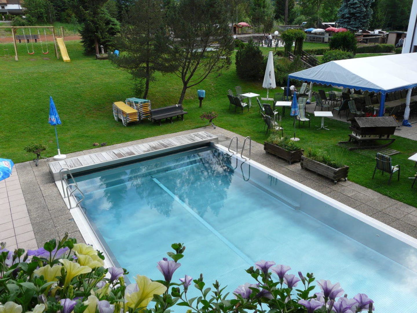 Blick vom Balkon zum Aussenpool