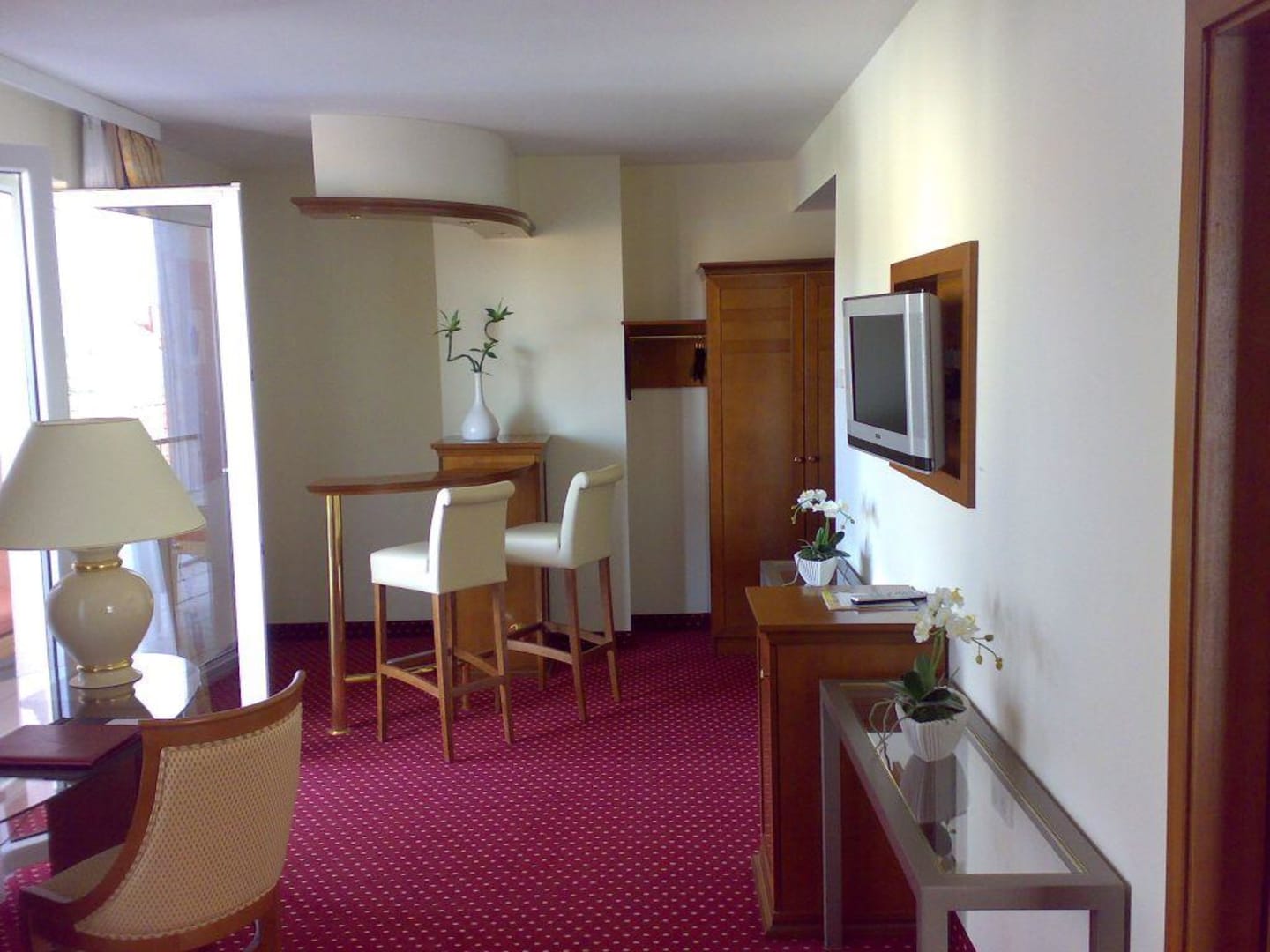 Die Bar im Wohnzimmer der SuiteFlachbildschirm, in alle Richtungen drehbar, links gehts auf den Balkon