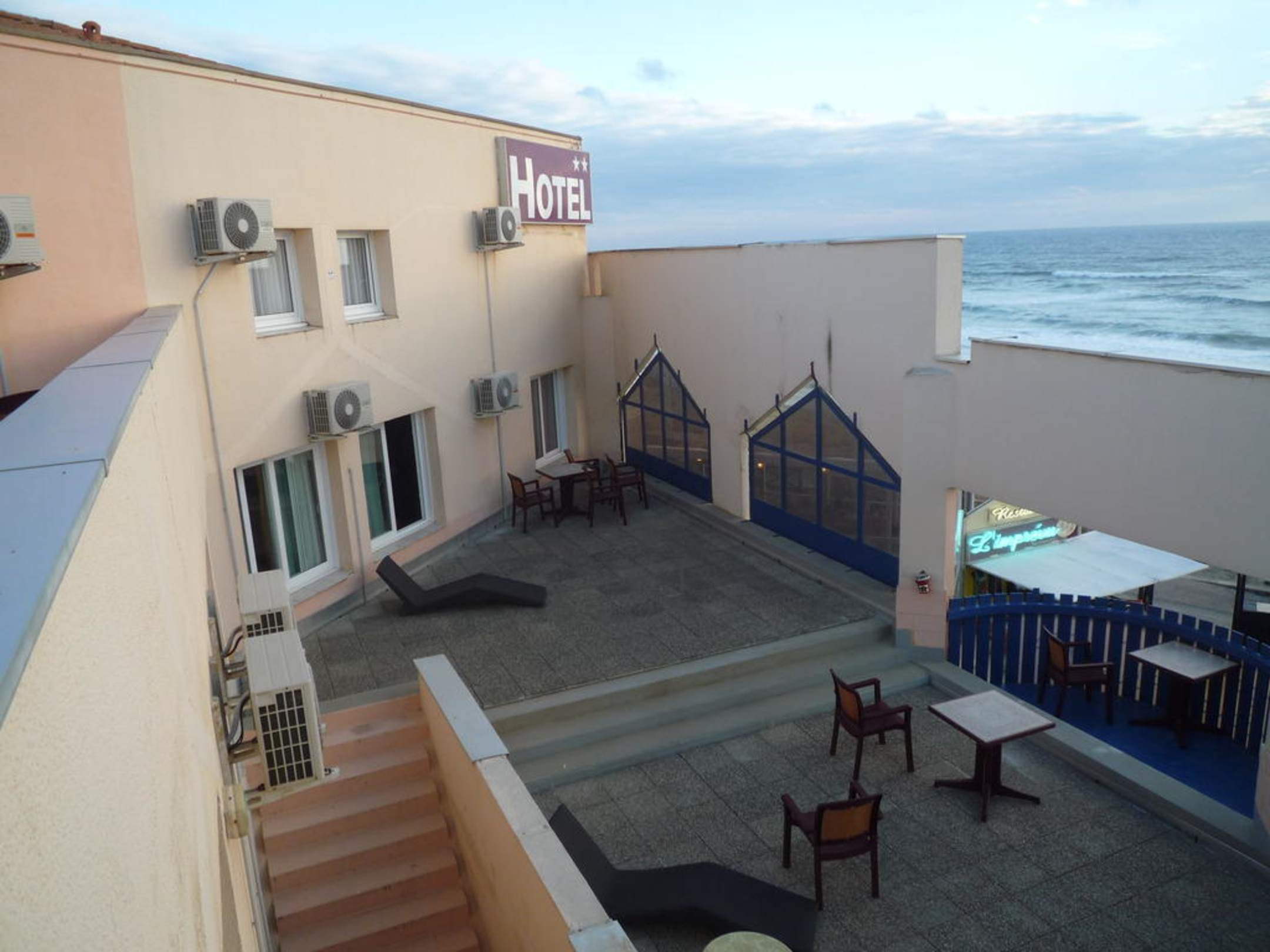Blick auf die Terrasse vor den Meersichtzimmern