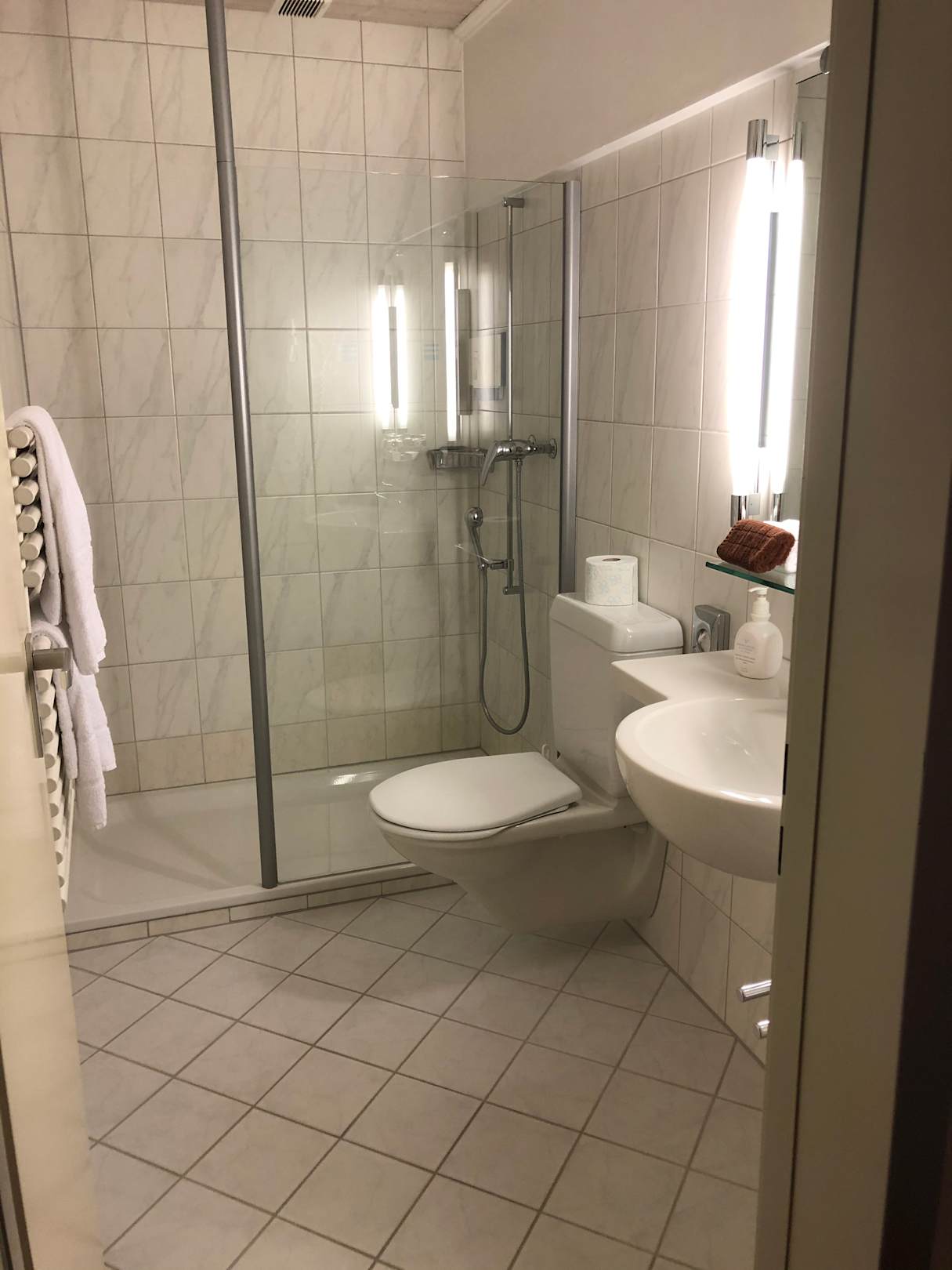 Nur kleines Stüfchen zur Dusche. Lüftung etwas laut, aber insgesamt sehr gepflegt.