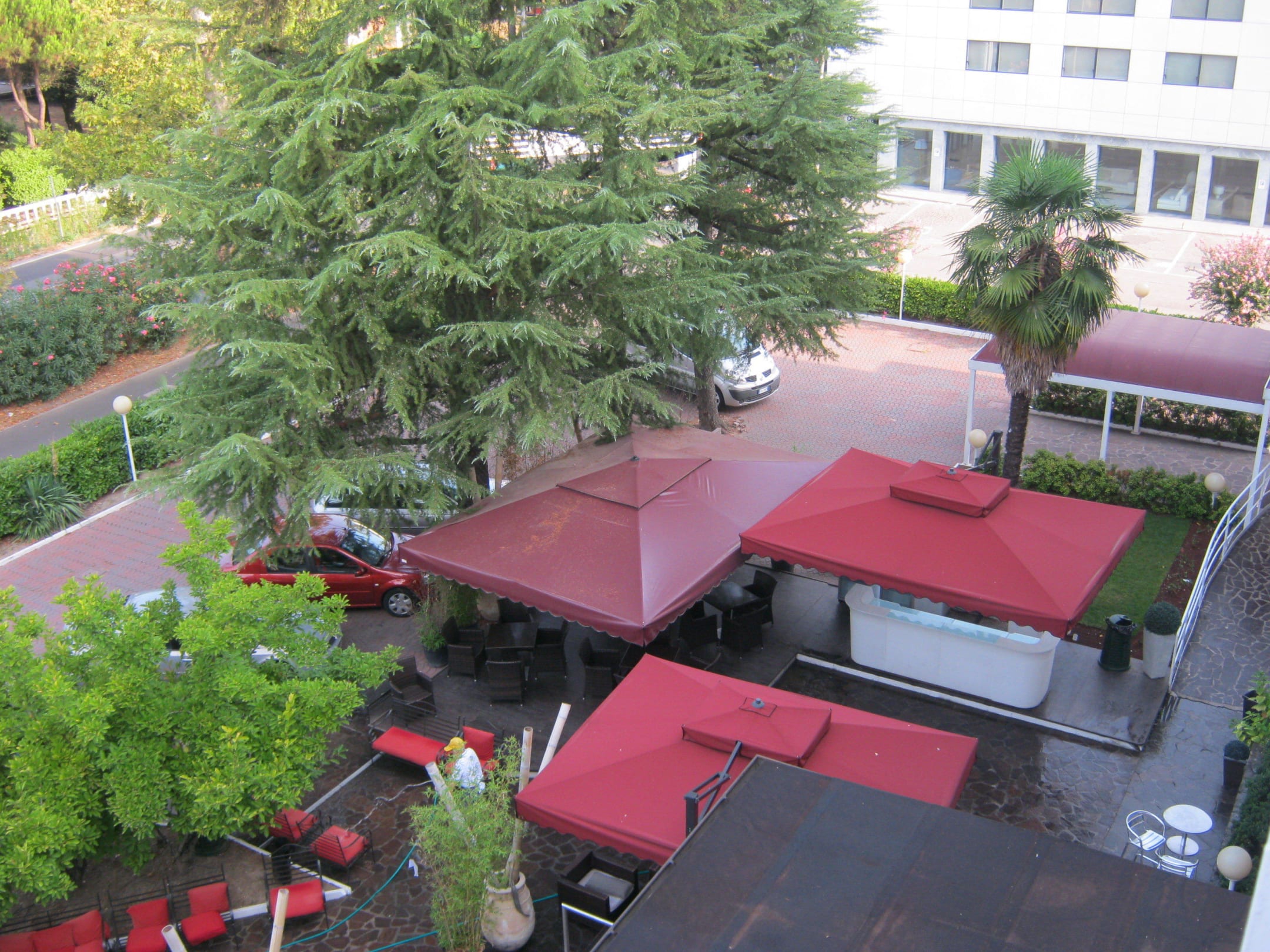 Blick vom Balkon zu den Außenberreichen des Hotels