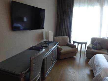 Sitzmöbel, kleiner Schreibtisch, TV-Flachbildschirm, Schränkchen mit Bar und Tresor