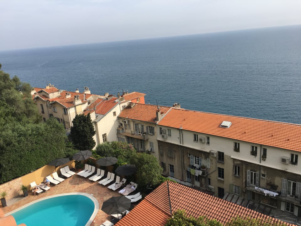 Ausblick vom Zimmer auf Meer und Pool