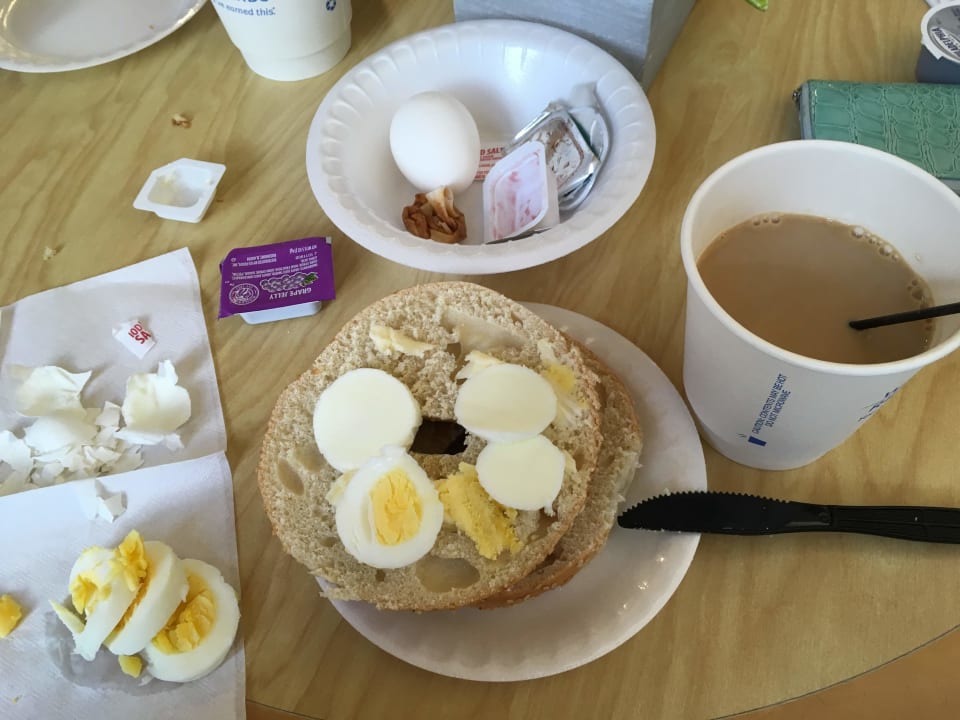 So sah mein Frühstück aus. Die Butter war so kalt, dass sie in annehmbarer Wartezeit nicht streichfähig war. Teller und Schüssel sind aus Styropor. Käse und Wurst: Fehlanzeige