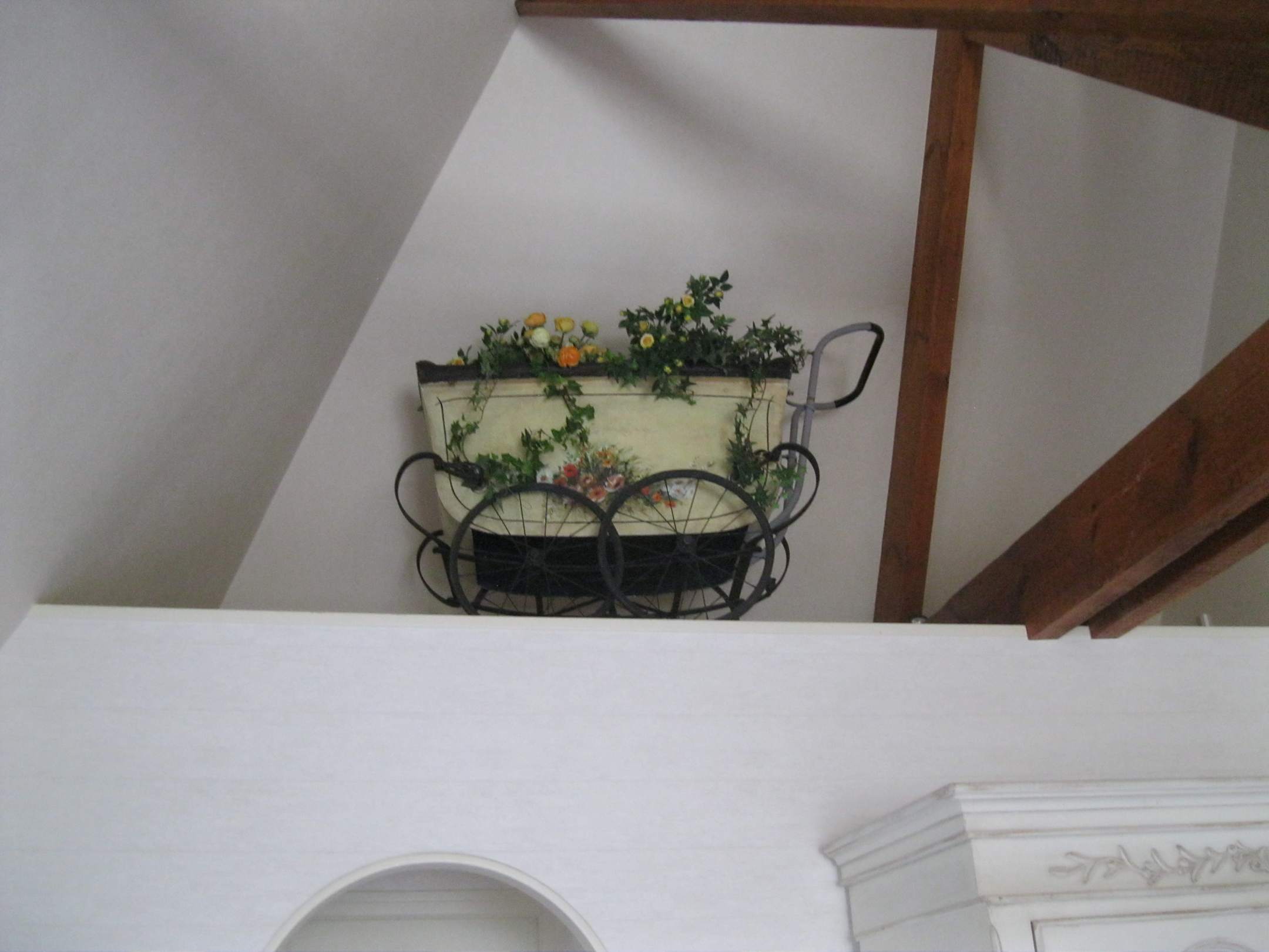 alter Kinderwagen als Deko in der Dachschräge des Zimmers