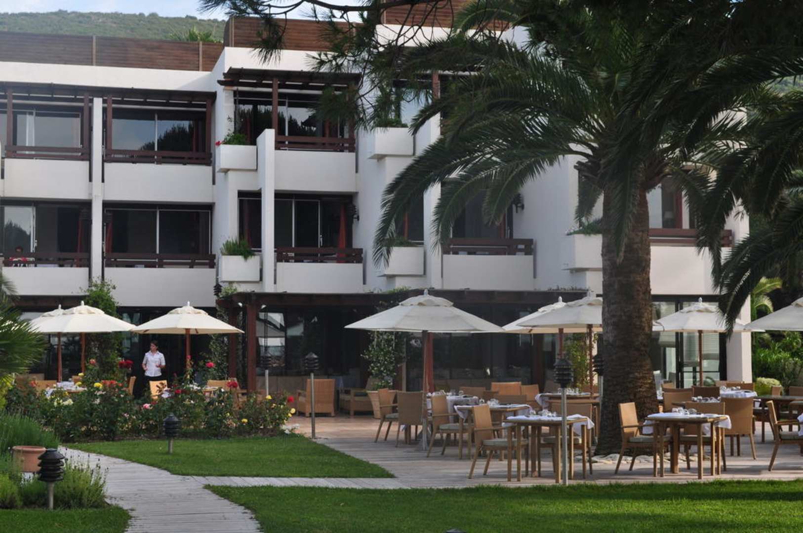 Hotel mit Garten vom Strand aus