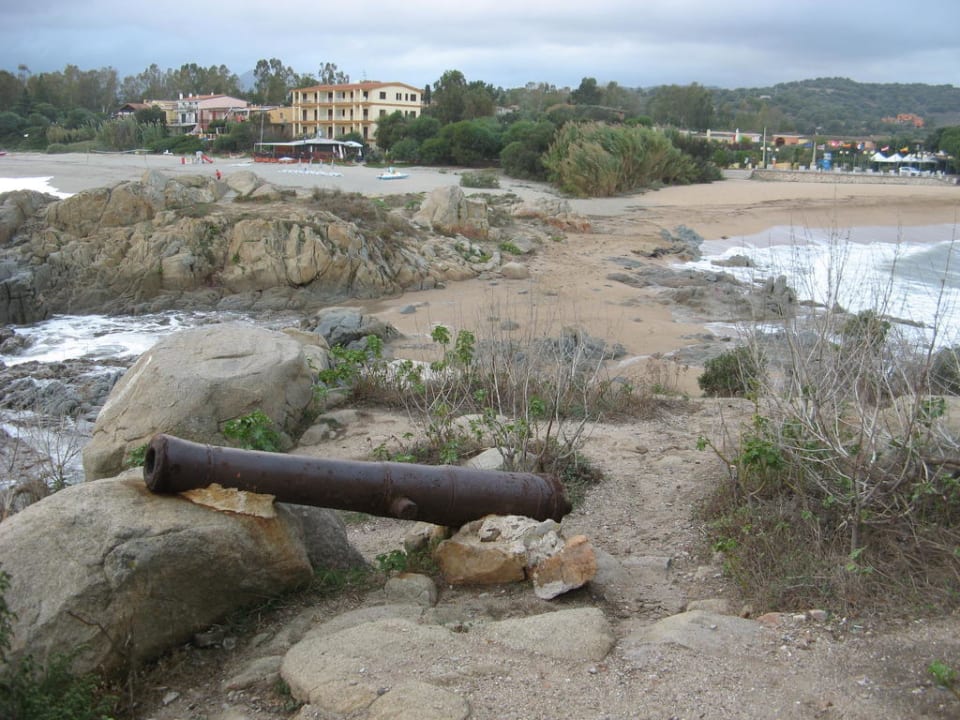 Hotel La Torre in Bari Sardo, SardinienHotel La Torre in Bari Sardo, Sardinien: Blick von dem alten Turm am Strand (mit altem Kanonenrohr), an dieser Stelle teilt sich der Strand und führt in 2 verschiedenen Richtungen weiter, am rechten Bildrand ist das Hotel zu sehen