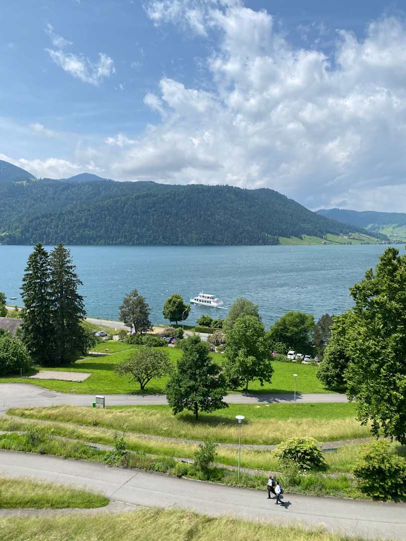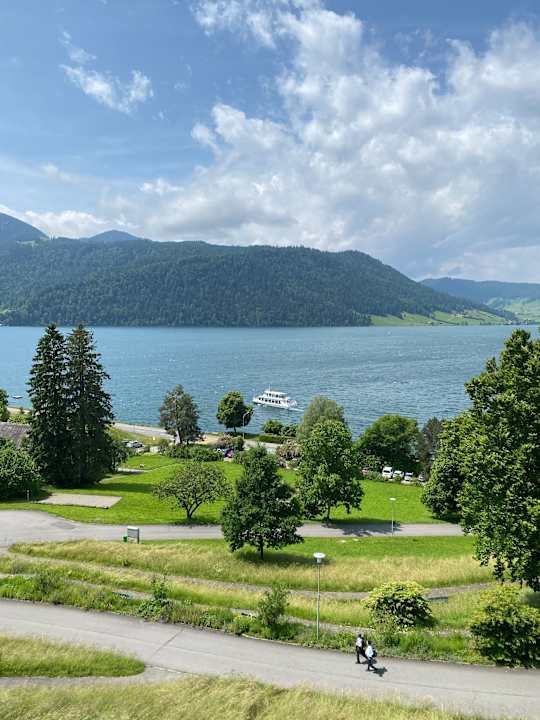 Ausblick aus dem Zimmer 436 mit Kursschiff. Steg ist gleich über die Strasse.