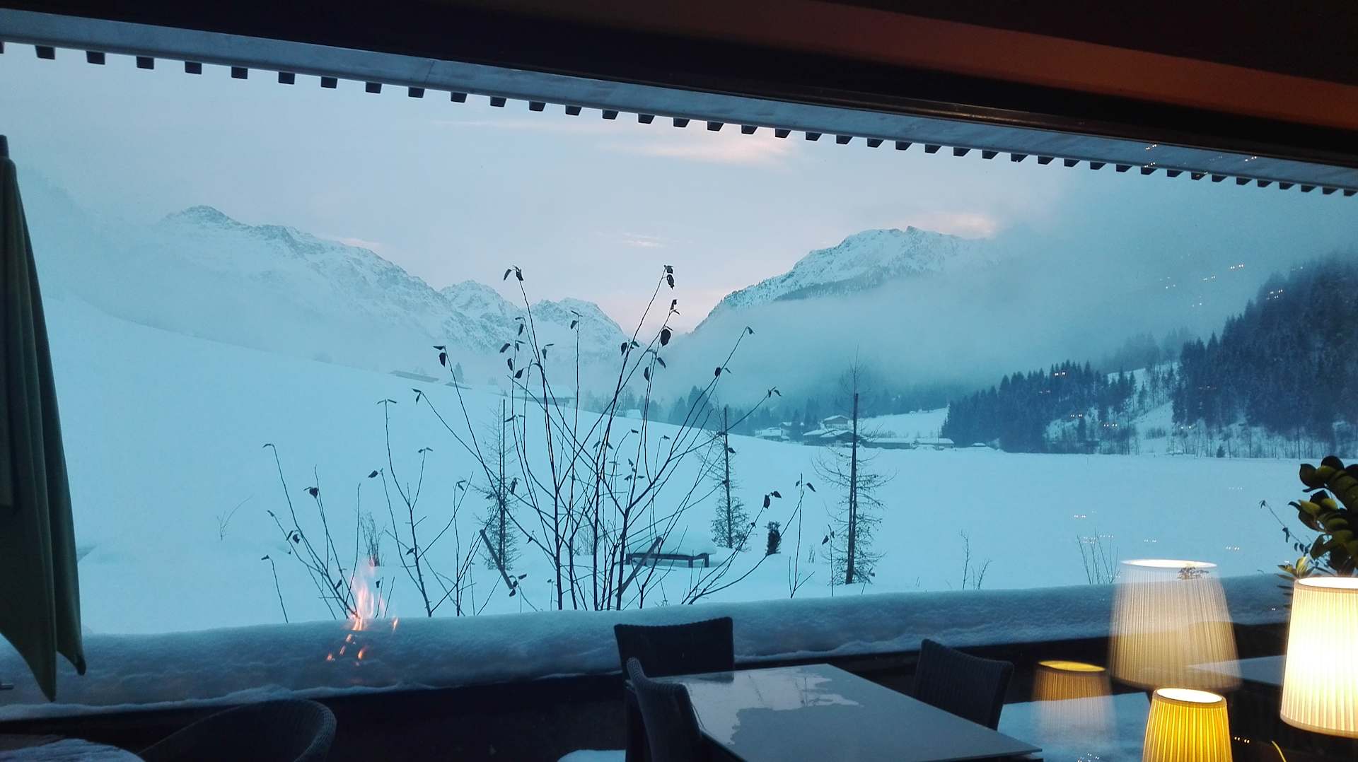 Ausblickdurch das Panoramafenster im gemütlichen Kaminzimmer bei einem knisterndem Feuer