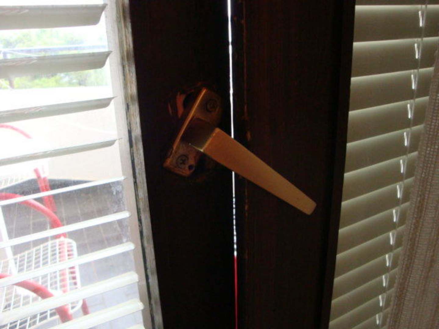 Takto jsme si museli zavírat dveře na terasu-prostě tu kliku otočit na druhou stranu,protože u dveří chyběly panty,které zřejmě někdo před hodně dlouhou dobou vykopnul a od té doby se na to nikdo nepodíval.
