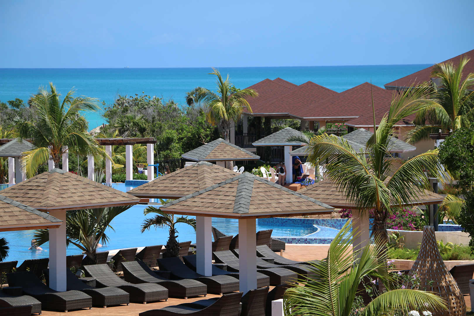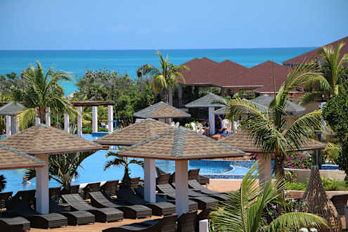 PoolPoolanlage unter Palmen, im Hintergrund einige der Restaurants
