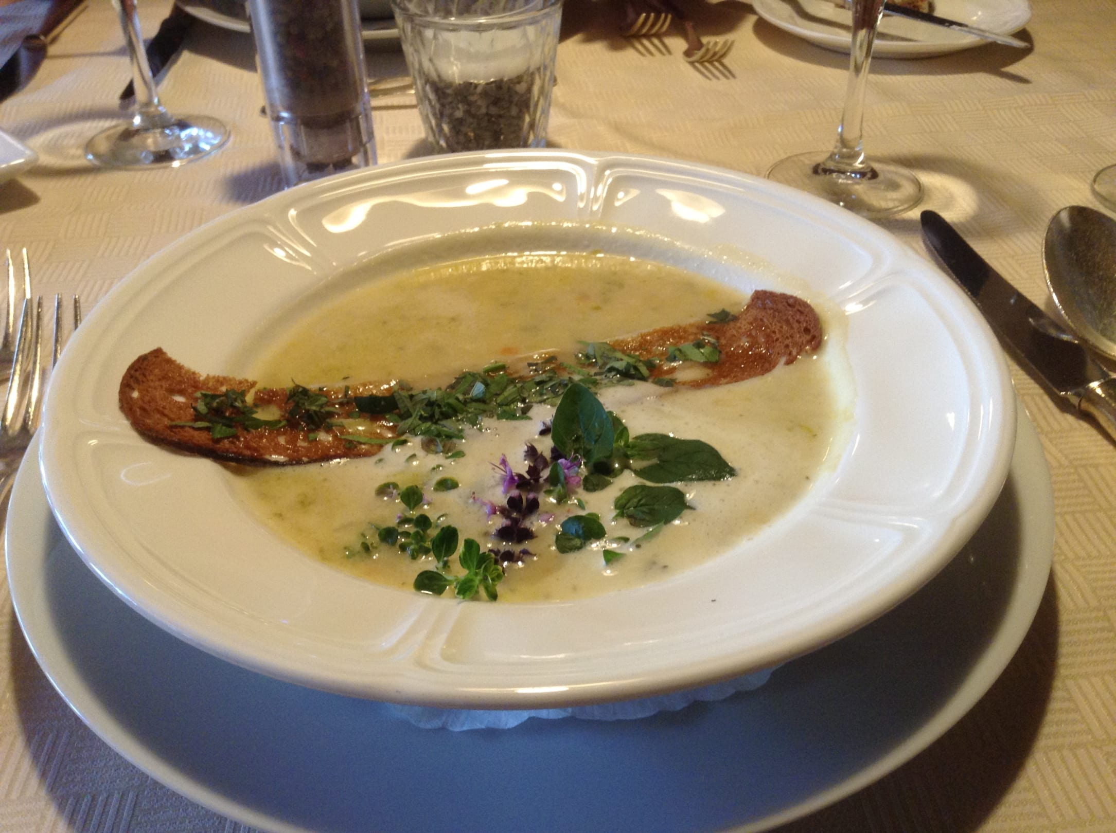 GastroVorspeise: lecker Schneckensuppe mit gerösteter Brotkruste und Wildkräuter