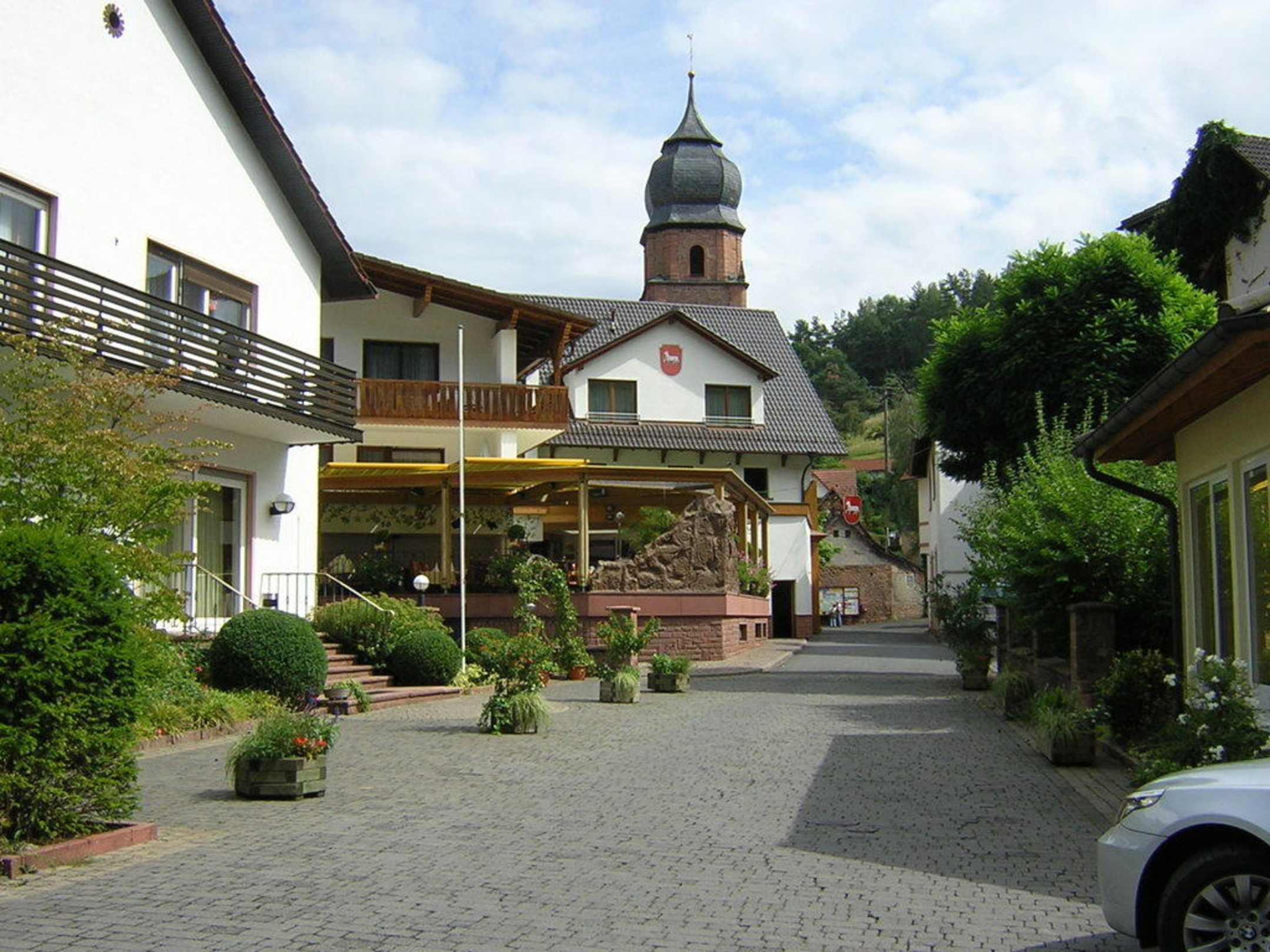 Blick vom Parkplatz auf das Haupthaus des Hotel Lamm
