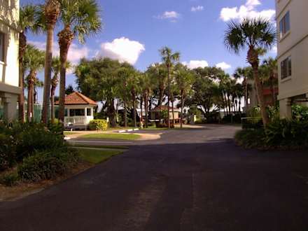 Der Eingangsbereich ist durch ein kleines Pförtnerhäuschen mit Schlagbaum gesichert. Die Straßen sind sauber und die Anlage ist gepflegt.