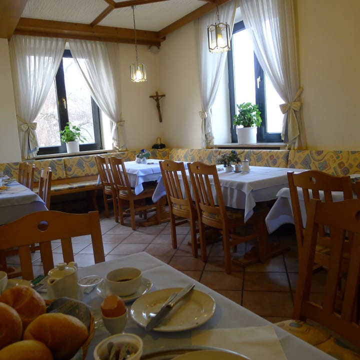 Frühstücksraum mit Blick auf die Felder ringsherumHeller, freundlicher Gästeraum, wo Frühstücksbuffet und Halbpension serviert wird.