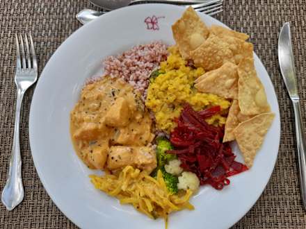 GastroBeispiel einer Hauptspeise aus dem ayurvedischen Restaurant (am Buffet selbst zusammengestellt)