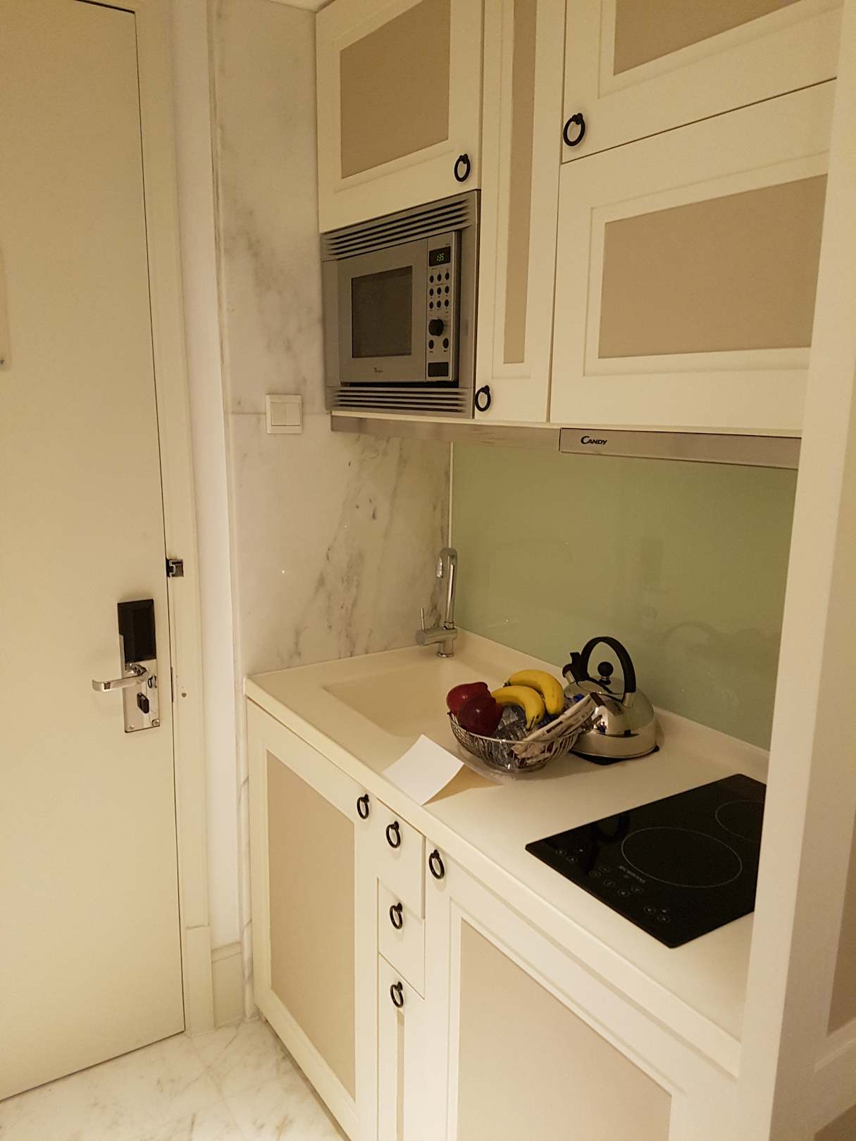 Küchenzeile im Zimmer mit Begrüßungspaket.