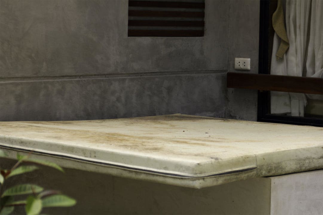 vergammelte Matratzen lagern vor den Bungalows. Gleiche Matratzen wie in den Betten