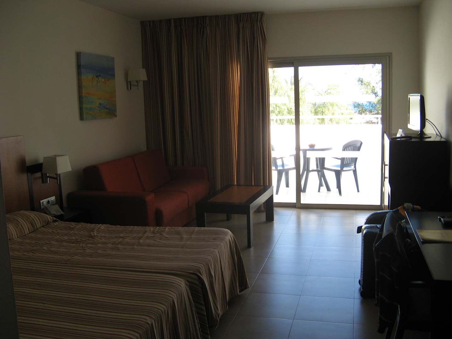 großes Doppelzimmer mit Nachttischen und Telefon, zusätzlicher Couch , kleinen Tisch, Schreibtisch, Minibar (Kühlschrank), Wasserkocher, Fernseher (Flachbild), großen Kleiderschrank, große Terrasse mit Tisch, Stühlen und Trockenständer