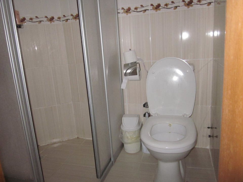 Auf kleinster Fläche Dusche, WC und links von der Dusche noch das Waschbecken