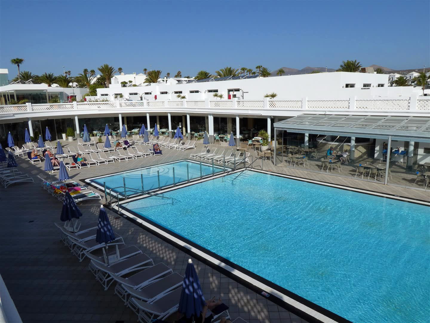 Blick auf die Poolanlage vom oberen Anlagenbereich