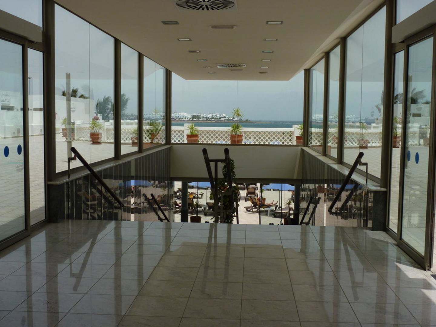 Treppe von der Halle zum Restaurant, Bar und Pool