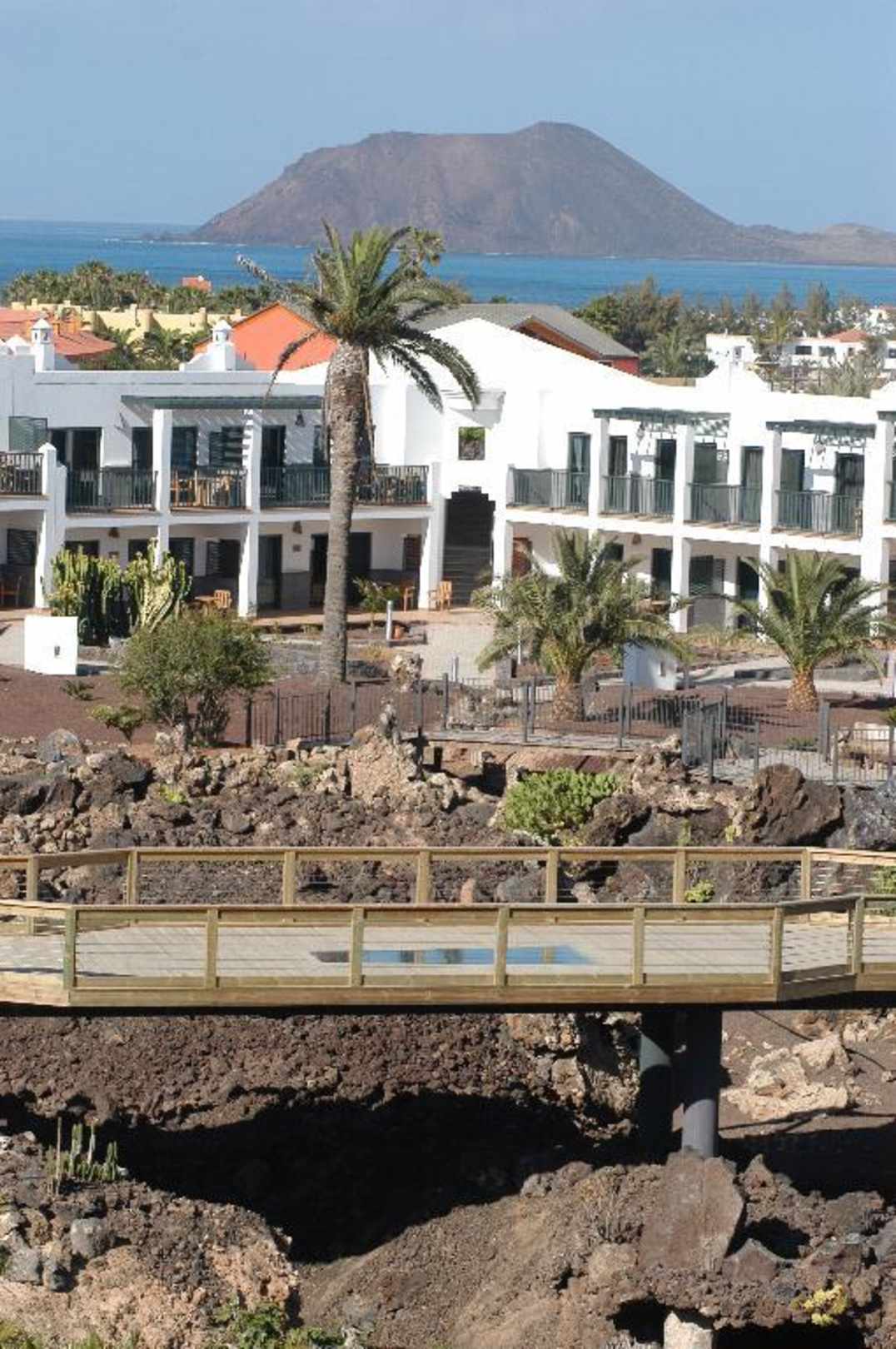 Die Hotelaussenanlage (Vulkanzone) mit Blick zur kleinen Insel Lobos vom Hotel " Las Marismas de Corralejo" auf Fuerteventura