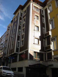 Hotel Lausos AußenansichtDie Suiten befinden sich ganz oben im 4. und 5. Stock, die Gästezimmer in drei Stockwerken darunter.