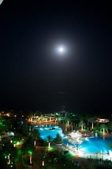 Beleuchtete Aussenanlage vom Balkon aus bei Mondlicht