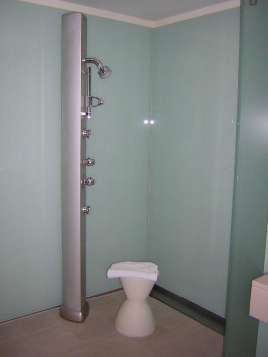 Die Duche ist ebenerdig und mit einem Notrufseil ausgestattet. Der Duschhocker ist immer im Zimmer, ggf. gibt es einen zweiten dazu. Die Dusche ist ein Genuß und nur zu empfehlen.