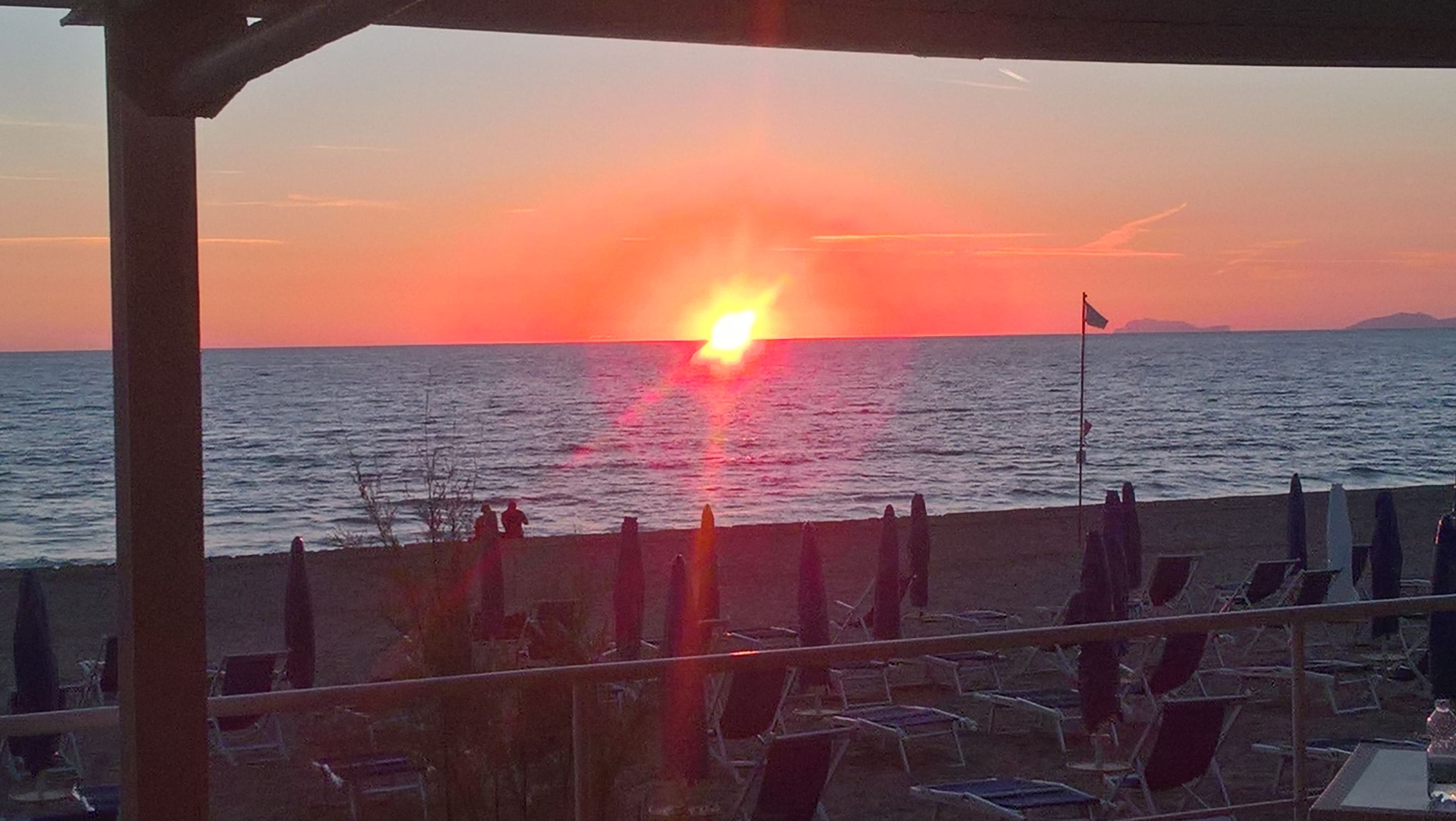 Wenn die rote Somme bei Capri im Meer versinkt... Sonnenuntergang am Strand vom Hotel Le Palme, rechts von der Fahne befindet sich die Insel Capri
