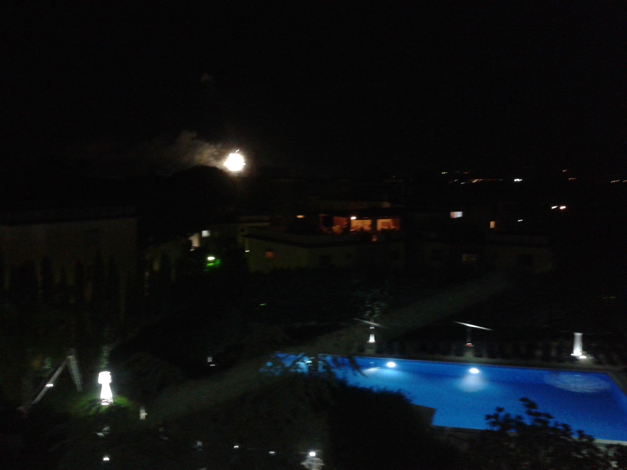 Blick auf den Pool vom 3. Stock, bei Nacht