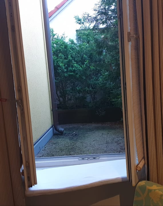 Lt. Hotelprospekt Zimmer mit " Flair". Ein "superior-Zimmer in der gehobenen Preisklasse, dafür sehr dunkel und mit ganz tollem Ausblick auf den muffigen Hinterhof, in den die Dachentwaässerung läuft.