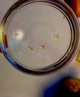 SÄMTLICHES Geschirr (Gläser, Teller, Tassen, Behälter) ist dreckig oder hat einen Sprung, sodass man sich die Lippe daran aufschneiden kann. Dieses Schälchen wurde mir als "frisch" gegeben, um Honig hinein zu füllen.