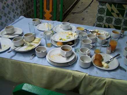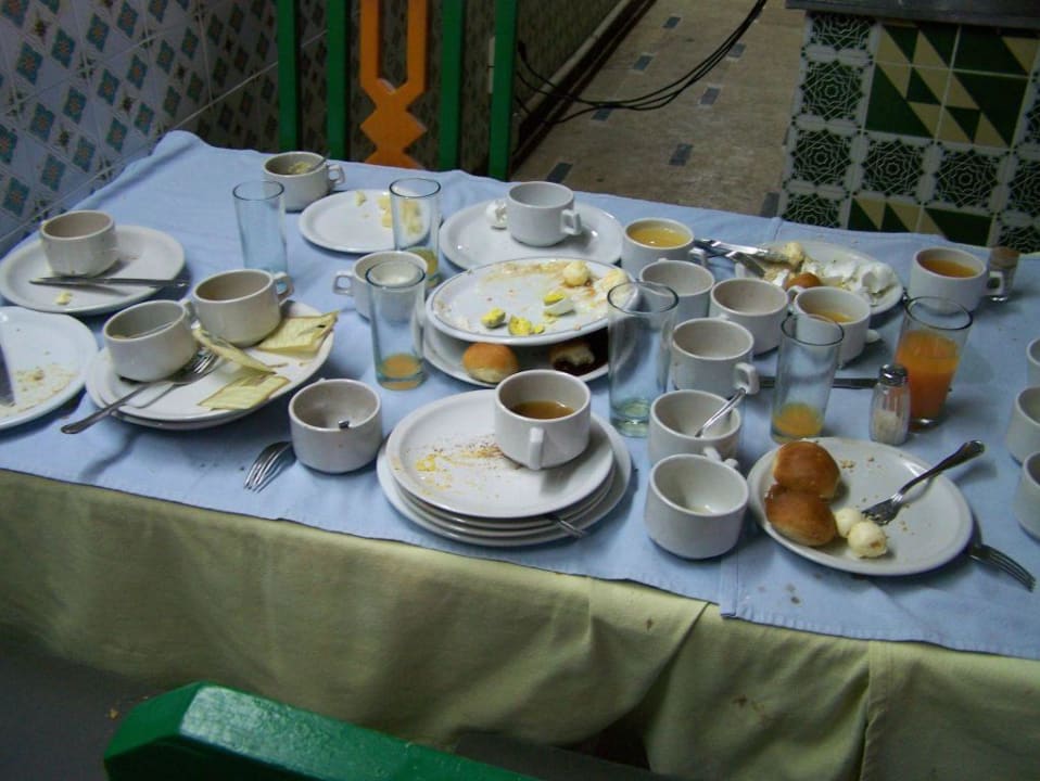 Stół podczas typowych posiłkówGoście z OAZISA poprosili rezydenta, żeby nie dał się zwieść menadżerowi hotelu i przyszedł na stołówkę nie w chwili otwarcia (wówczas godzinę wcześniej), ale za godzinę, czyli w oficjalnych godzinach otwarcia. To co widział rezydent, tego nie odda żadne zdjęcie. Rezydent uznał wówczas zastrzeżenia gości do stanu stołówki i potraw za zasadne. Dobrze, że rezydent (drobna dziewczyna) nie musiał próbować serwowanych potraw.