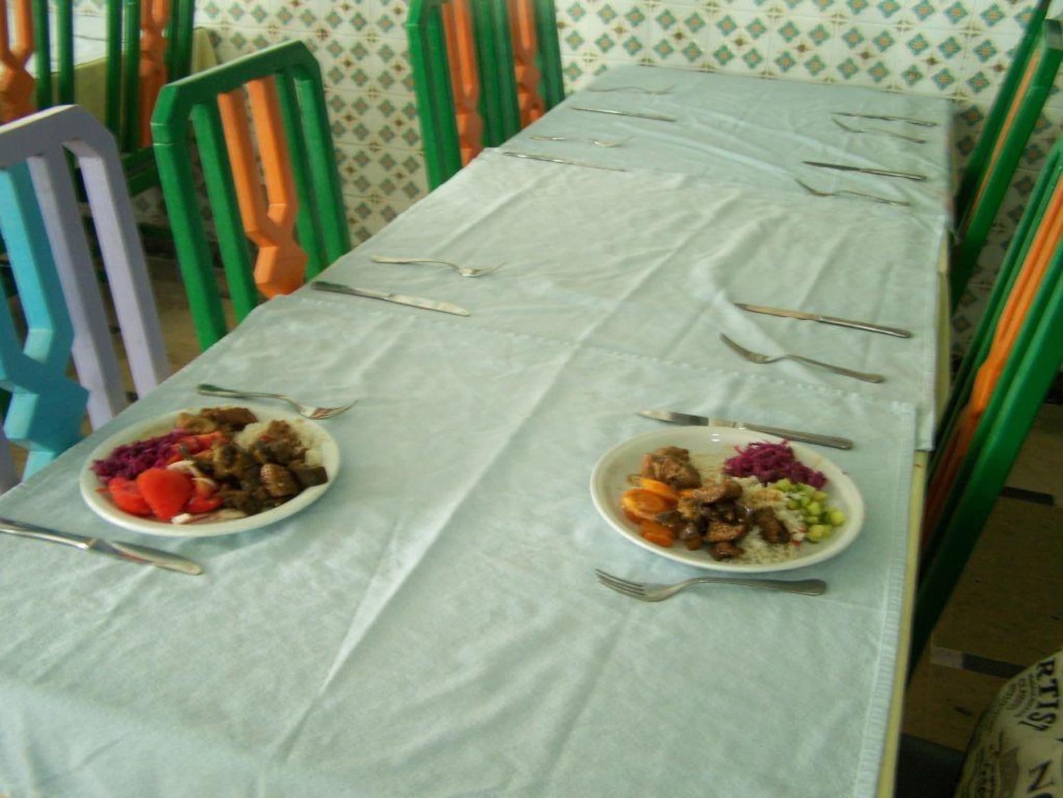 Stół nie dla vipówPozostałe stoły miały, jak zwykle, obrusy nie pierwszej świeżości i pognięcione. Nie było na nich ani serwetek, ani przypraw. Leżały jedynie sztućce. Właśnie zajęliśmy miejsce i znosiliśmy potrawy na stół. Pytanie, dlaczego na stołówce tak pusto - nie ma gości. Otóż, z uwagi na stanowisko rezydenta OAZISA, twierdzącego, że pozostanie w hotelu aż do kolacji, żeby sprawdzić zastrzeżenia gości co do czystości i potraw, dyrekcja hotelu otworzyła stołówkę o godzinę wcześniej, o czym nie powiadomiono gości. W ten sposób na stołówce był zupełny "luz". Godzinę wcześniej na stołach pojawił się również PEŁNY zestaw potraw (chyba ściągnięty z hotelu Kheops) oraz kartki przy poszczególnych potrawach z ich nazwami w języku angielskim. Po drugiej stronie stołu szwedzkiego stało, w białych kitlach, pięciu kucharzy. Była to tunezyjska fatamorgana - widok, jak podczas pochodu 1-majowego w PRL.
